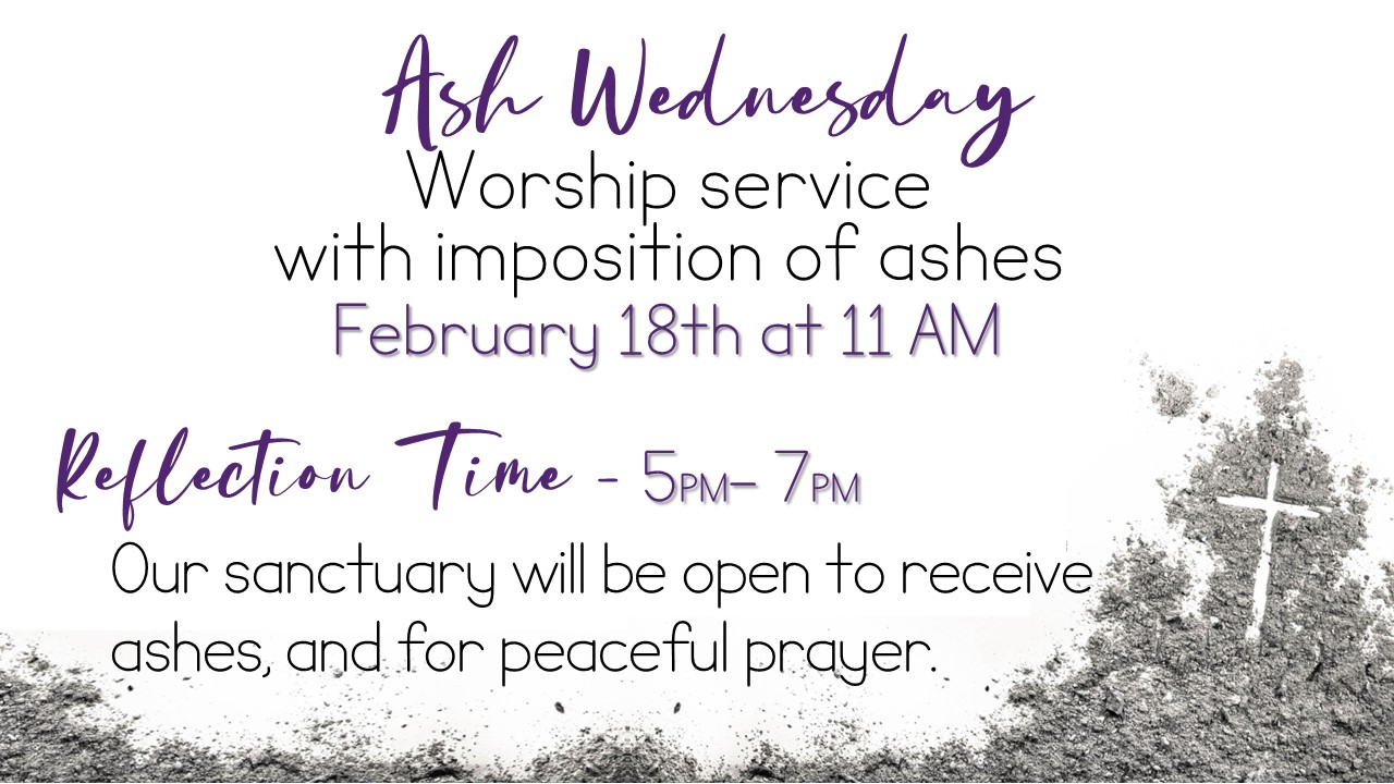 Our service begins at 11a.m and will include an imposition of ashes and Holy Communion. A 5-7pm we wil hold a time of reflection and prayer.
