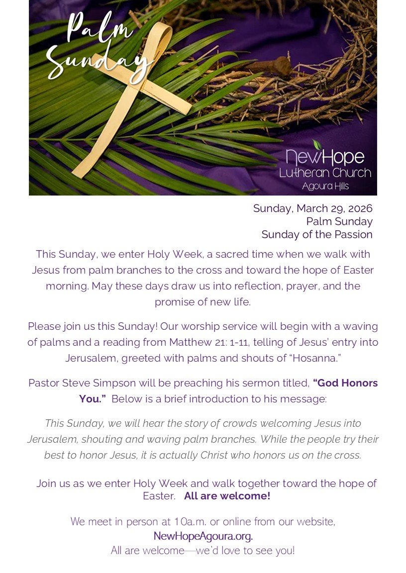 Join us this Palm Sunday/the Sunday of the Passion. We meet at 10a.m. in the sanctuary or join us online.